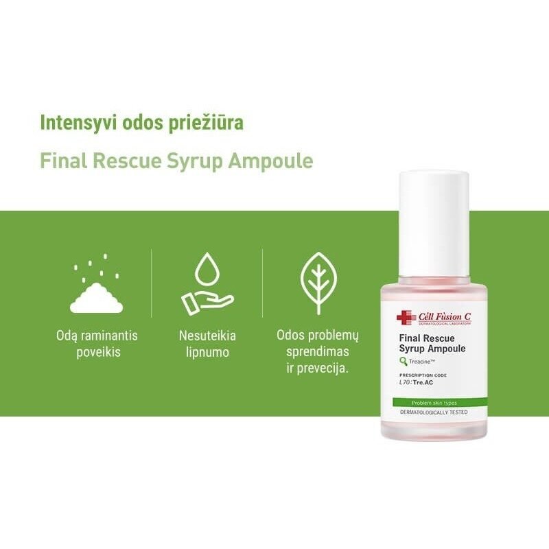 „Final Rescue Syrup Ampoule“ serumas itin tinka riebiai, probleminei, mišriai ir aknės pažeistai odai, kadangi jis ramina sudirgintas ir pažeistas vietas. Jis akivaizdžiai sumažina odos riebalų išsiskyrimą ir drėkina veido odą, nesukurdamas riebios odos išvaizdos. Aplikavus ant odos, nėra jaučiamas sunkumo jausmas, nes yra lengvos ir neriebios tekstūros, todėl greitai įsigeria į veido odą ir sukuria matinį efektą.